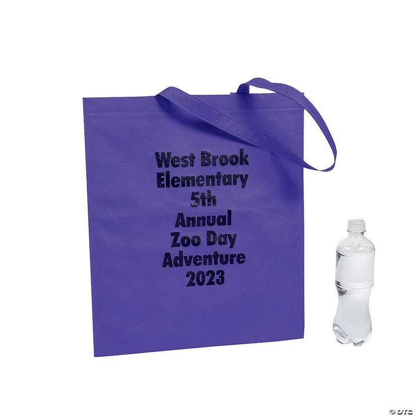 β’ Durable Quality: Made of cloth, this sturdy tote bag wonβt let you or your accessories down. Plus, you can easily store the reusable bag away until you need it again. β’ Eco-Friendly: Ditch the plastic bags and go green with this eco-friendly tote bag! Mother Earth is sure to appreciate the gesture, so go ahead and gift this tote bag to your friends and family while youβre at it! β’ Travel-Friendly: No matter where your day takes you, this tote bag is sure to be a handy companion! Designed with easy-to-use straps and a spacious interior compartment, this tote bag is ready for on-the-go fun! Product Description:Go bright and bold with these large tote bags, which you can customize with your own message in the color of your choice! Durable and earth-friendly, these totes are ideal for carrying anything, anywhere. They’re great for swag bags, and can be reused to tote around groceries, library books, gym clothes and your everyday essentials. Size: 15″ x 17″ with 12″ handlesQuantity: 24Material: Nonwoven polypropylene.Personalize with up to 7 lines of text.Β© OTC