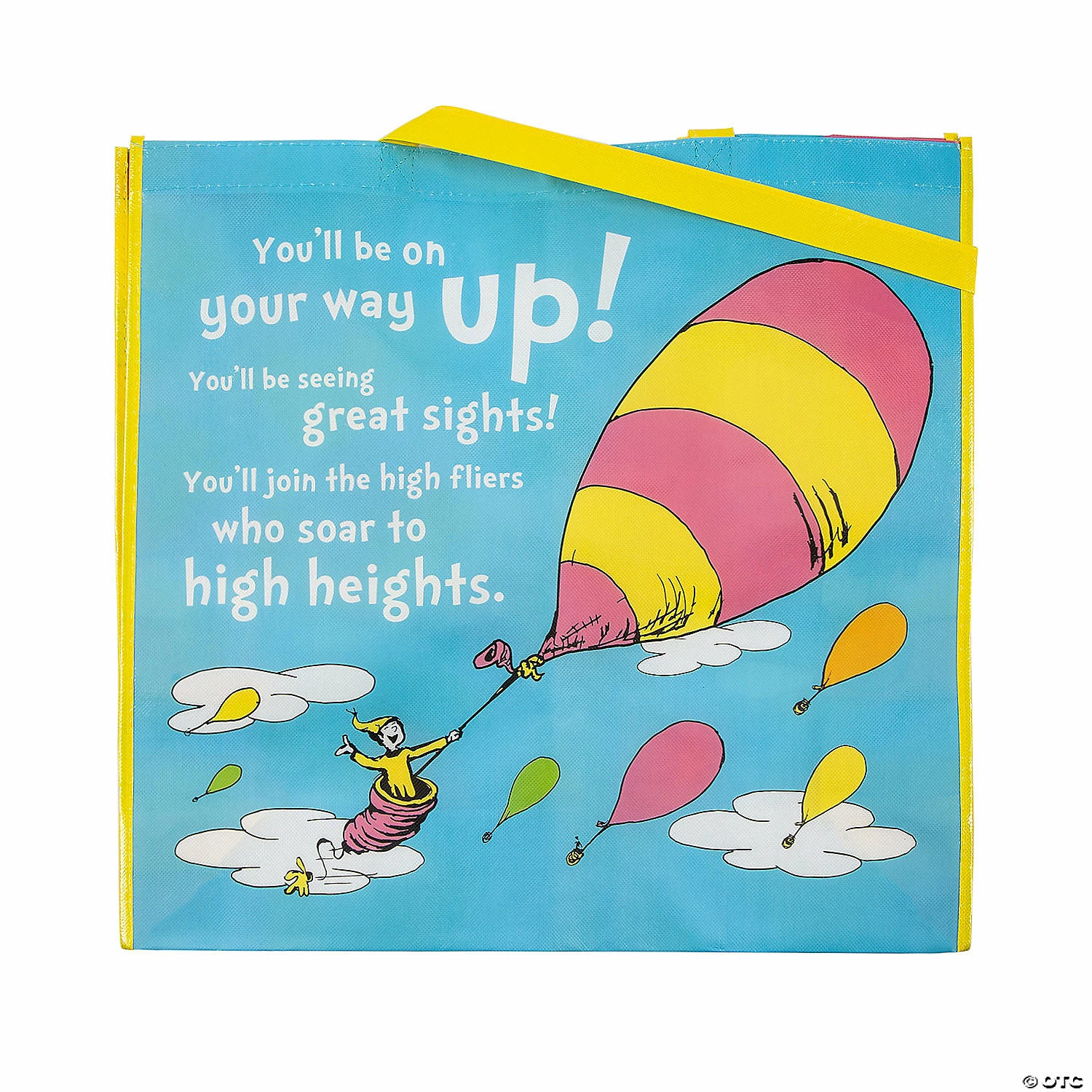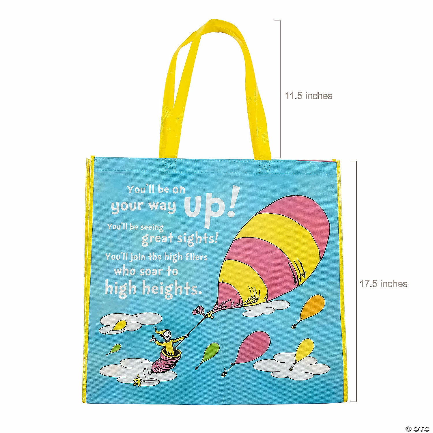 • Durable Quality: Made of cloth, this sturdy, colorful tote bag won’t let you or your accessories down. As an added bonus, you can easily store the reusable bag until you need it again. • Eco-Friendly: Ditch the plastic bags and go green with this eco-friendly tote bag! Mother Earth will appreciate the gesture, so go ahead and gift this Dr. Seuss™ tote bag to your friends and family while you’re at it! • Travel-Friendly: No matter where your busy day takes you, this tote bag is sure to be a convenient companion! Designed with easy-to-use handles and a spacious interior compartment, this tote bag is ready for on-the-go fun!Product Description:Oh, the places you’ll go! This spacious tote is large enough to carry schoolwork or pack up for a day at the beach. Featuring images and text from the beloved Dr. Seuss™ book, this tote is a must-have for new graduates or anyone beginning a new chapter in their lives. No matter all the places you go, this large tote will carry everything you need on your adventures! © OTC/ ™ & © Dr. Seuss Enterprises, L.P. All Rights Reserved.Size: 19″ x 6 1/2″ x 17 1/2″ with 11 1/2″ handles.Quantity: 1Material: Nonwoven polypropylene.