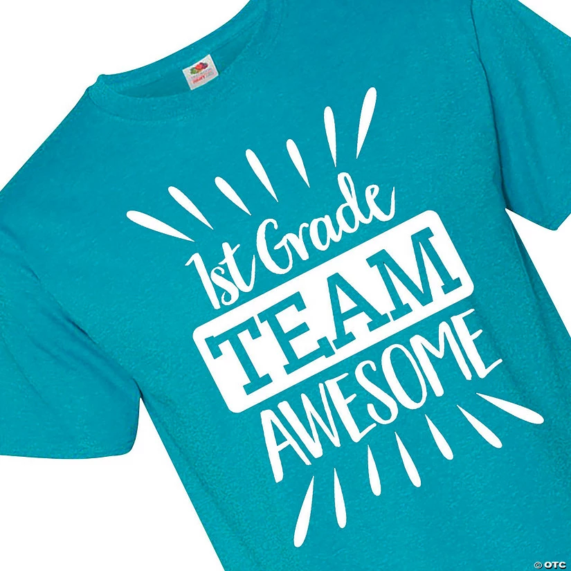 You’re a 1st grade teacher and proud, so scream it from the roof tops, or have this shirt do the screaming for you. A fun T-shirt idea for spirit week, teacher conferences or as a gift for a first grade teacher, the shirt is printed with “1st Grade” and “Team Awesome.” © OTC• Brand: Fruit of the Loom• Short sleeve• High-density fabric• 50% cotton/50% polyester• Tear away label• Double needle hemmed sleeves and bottom.• Need more? With our tees, we’ve got your back (and front)! To order in bulk for any size group, just call 1-877-513-0384. Or, give us a ring if you’d like to easily customize any of our pre-printed shirts with our free design service.