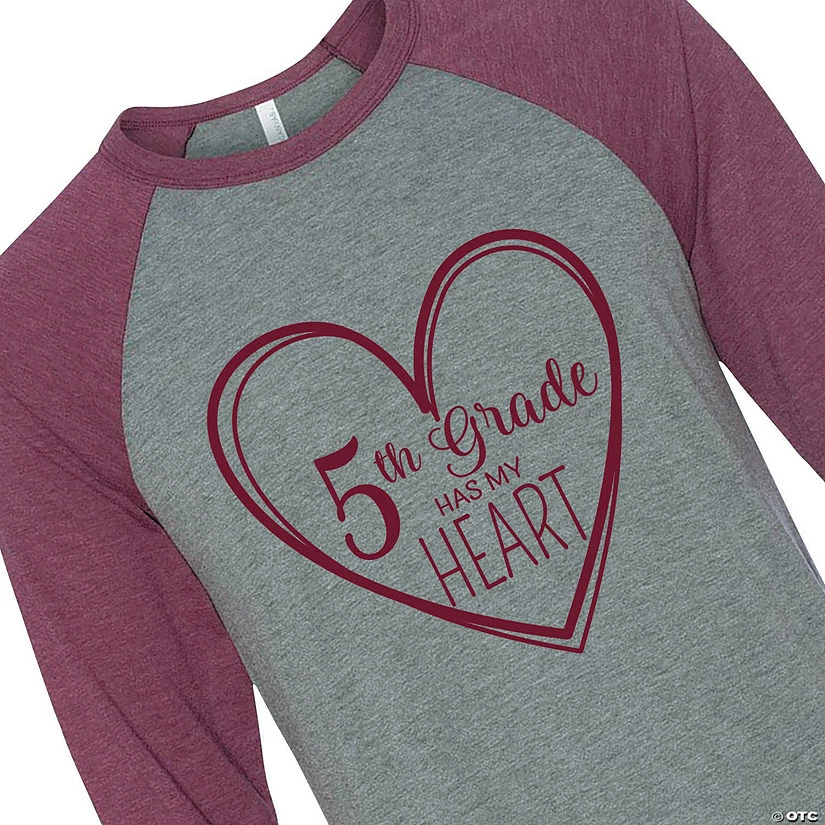 This teacher t-shirt is a soon-to-be wardrobe staple for 5th grade teachers! Printed with the outline of a heart and “5th Grade Has My Heart,” the raglan baseball tee is a great teacher gift. Search our site for oodles of school t-shirts for every grade level, and use them as Teacher Appreciation Week supplies. © OTC• Brand: Bella + Canvas• Three-quarter sleeve• Unisex sizing with side seams• Contrast raglan sleeves and neck trim. • 50% poly, 25% combed and ring-spun cotton, 25% rayon, 40 single 3.8 oz.• Need more? With our tees, we’ve got your back (and front)! To order in bulk for any size group, just call 1-877-513-0384. Or, give us a ring if you’d like to easily customize any of our pre-printed shirts with our free design service.