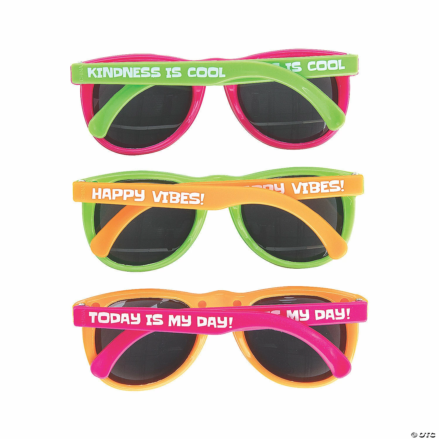 With positive vibes shining so bright, itβs a good thing theyβll have these shades to wear! These kid-sized sunglasses are just the right size for small faces and come in bright colors little ones will love to sport. With ear pieces that feature inspirational notes like, βToday is my dayβ and βKindness is cool,β this eyewear is just right for end-of-year school giveaways, birthday party favors and pool party prizes. For novelty use only. Plastic. 5″ x 1 3/4″ with 4 1/2″ ear pieces. Β© OTC