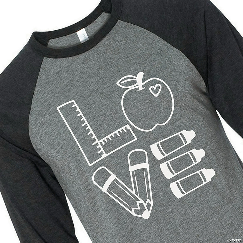 We love teachers, we love books…and you can show your teacher love with the help of this graphic t-shirt! Featuring notable teacher supplies of rulers, pencils, apples and crayons that are shaped to spell out “Love”. These tees make great thank-you gifts and birthday presents for the beloved teachers in your life. © OTC• Brand: Bella + Canvas• Three-quarter sleeve.• Unisex sizing with side seams.• Contrast raglan sleeves and neck trim.• 50% poly 25% combed and ring-spun cotton, 25% rayon, 40 single 3.8 oz.• Need more? With our tees, we’ve got your back (and front)! To order in bulk for any size group, just call 1-877-513-0384. Or, give us a ring if you’d like to easily customize any of our pre-printed shirts with our free design service.